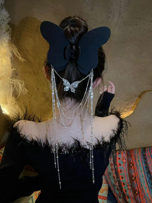 Black Butterfly Shining Rhinestone Tassel Hair Clip