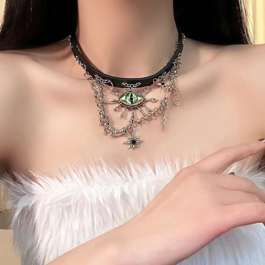 Y2K Spicy Girl Leather Tassel Green Devil's Eye Choker Necklace