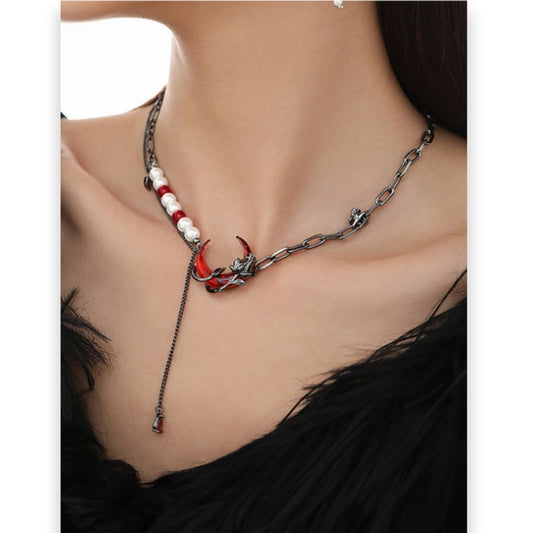 Dark Red Half Moon & Black Rose Pearl Tassel Necklace