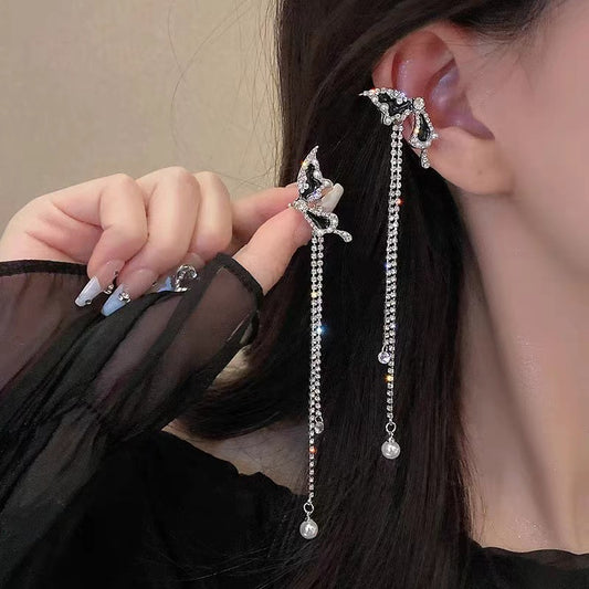 Schicker Ohrring mit Schmetterlings-Strasssteinen und langer Quaste (kein Ohrlochstechen)