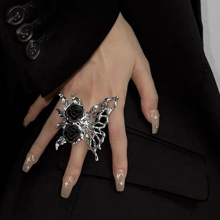 Authentischer verstellbarer Silberring mit Schmetterling und schwarzer Rose