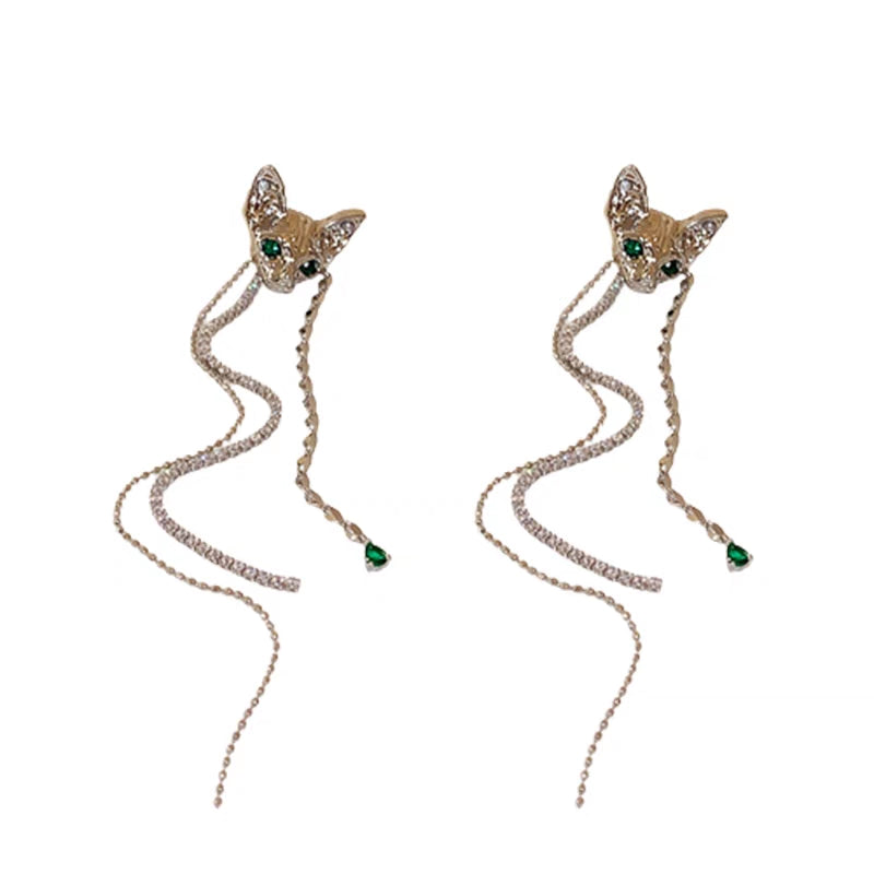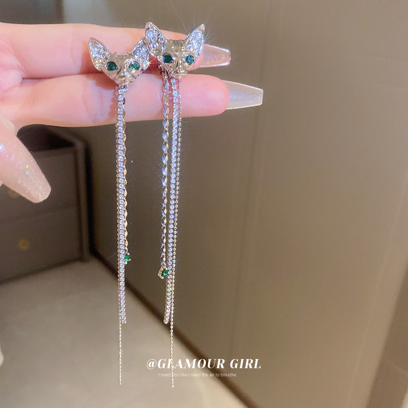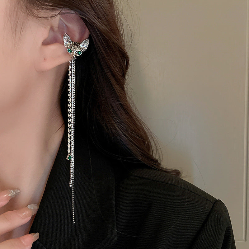 Niedliche Designer-Ohrmanschette mit langer Quaste und Katzenmotiv in Silber