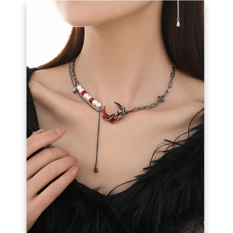 Dunkelrote Halskette mit Halbmond und schwarzer Rosenperle und Quaste