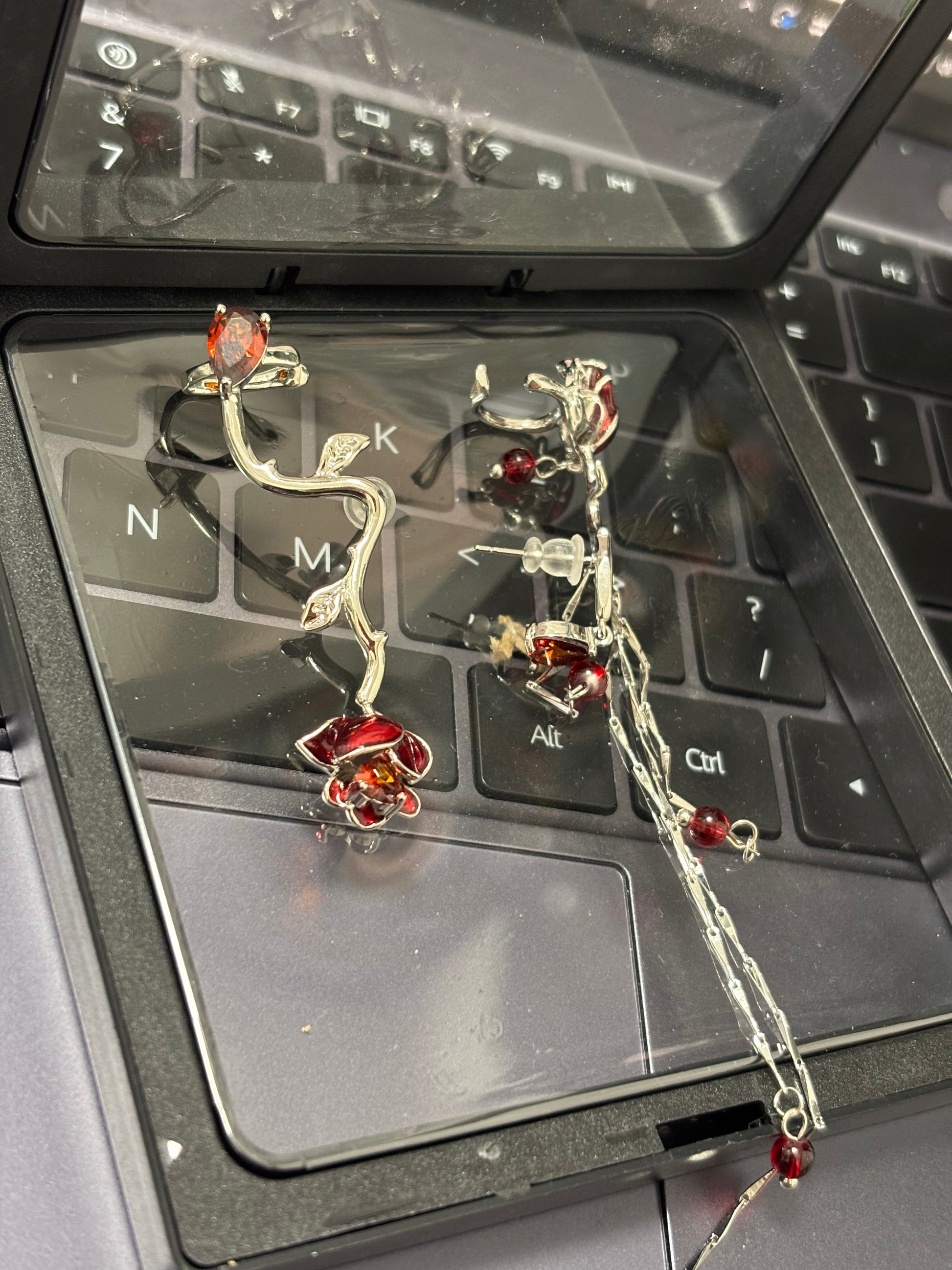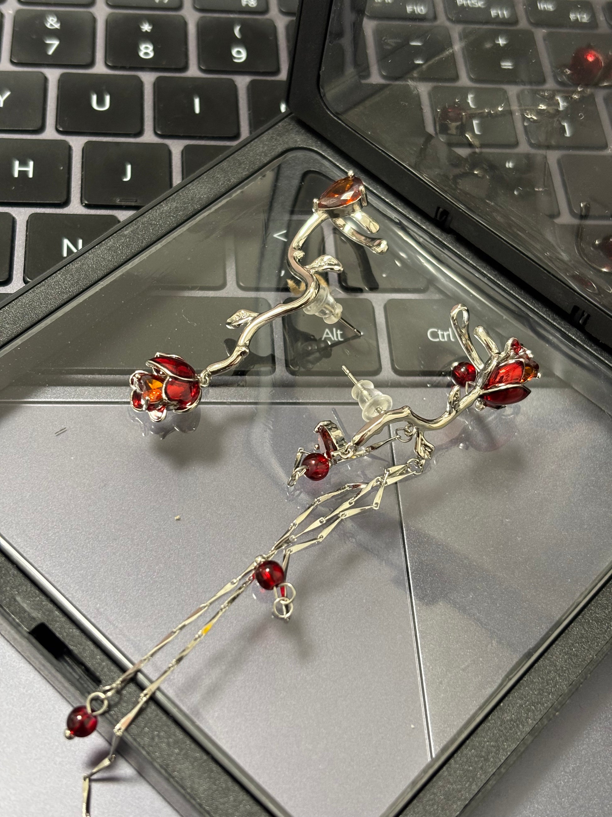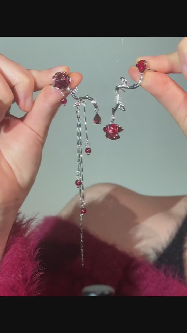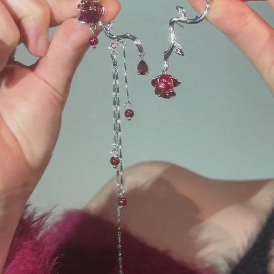 Asymmetrischer Designer-Ohrring mit roter Rose (kein Ohrlochstechen)