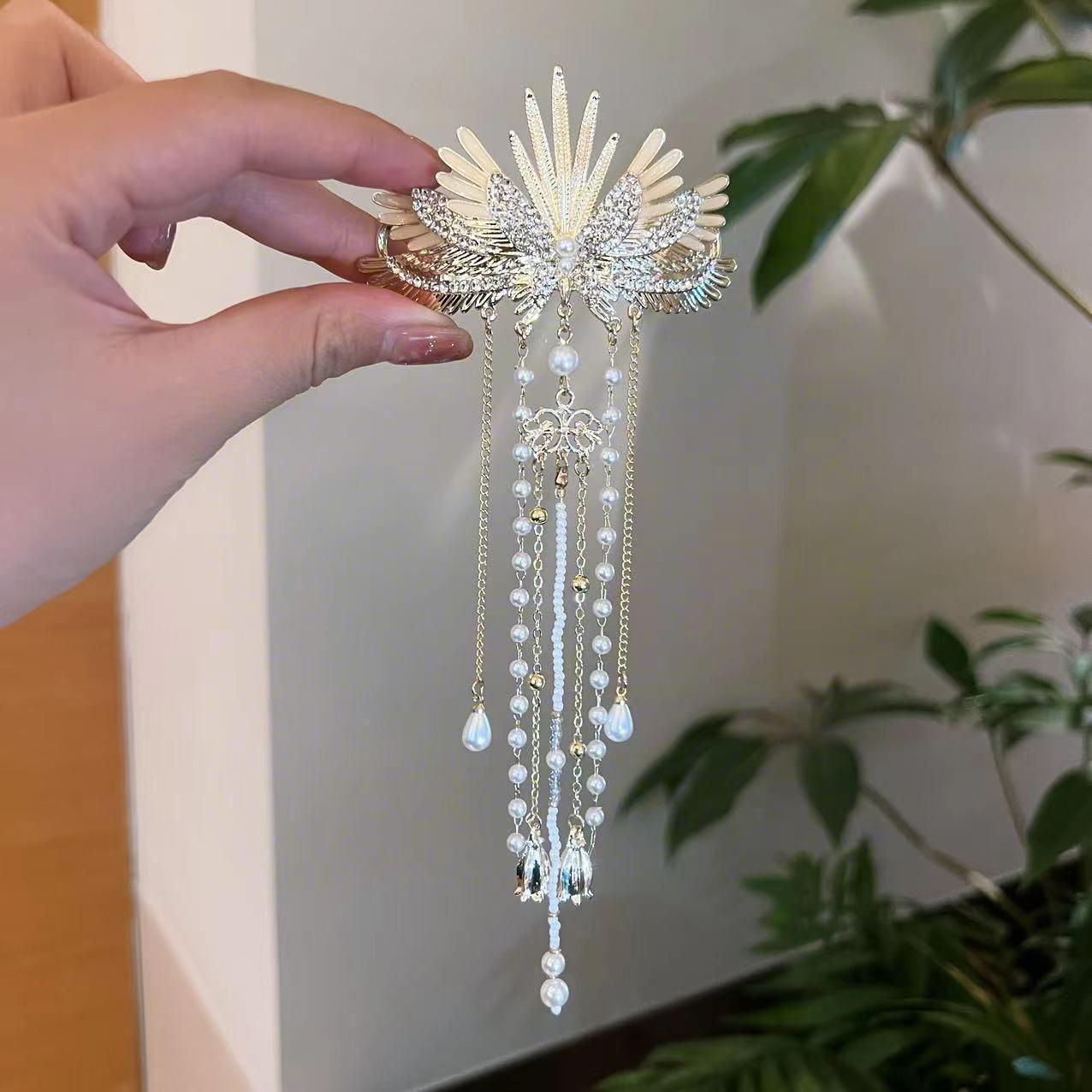 Ausgefallene wunderschöne goldene Haarnadel mit Engelsflügel-Quaste für Frauen