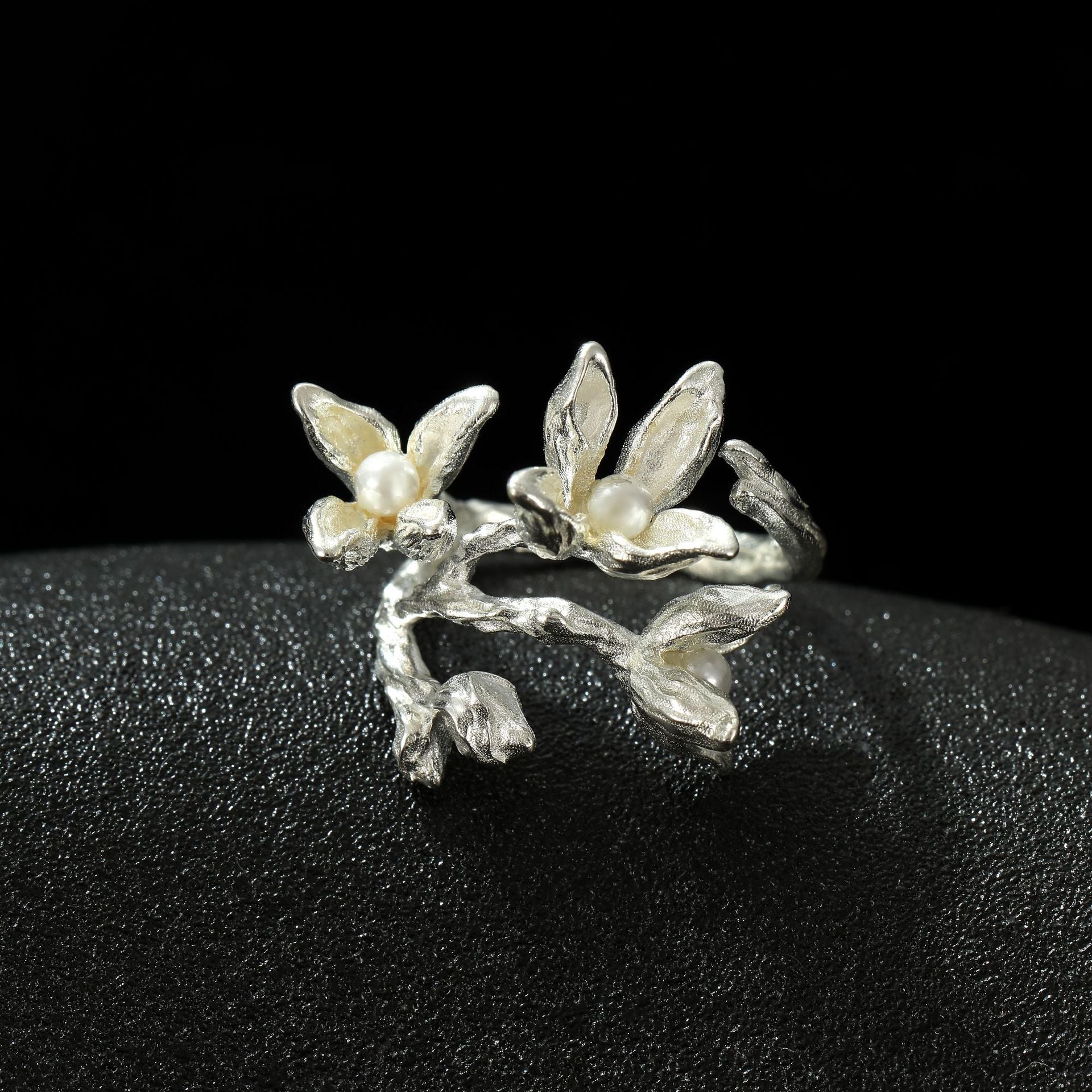 S925 Silber Damen Blumenperle Verstellbarer Ring