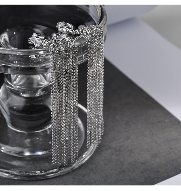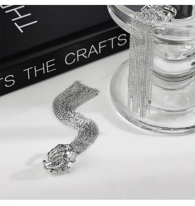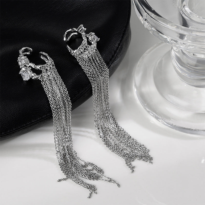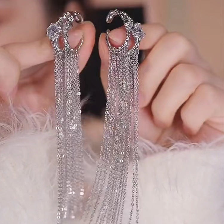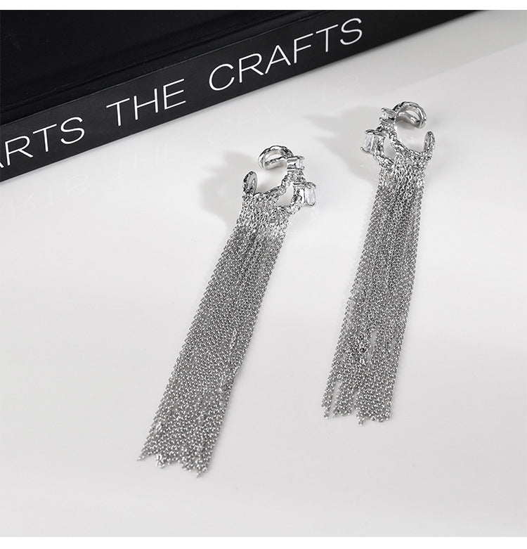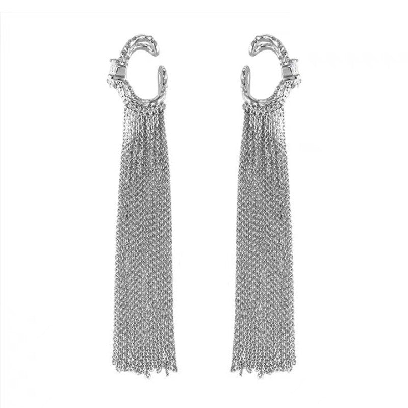 Silberne Ohrmanschette mit langer Quaste und Strasssteinen für Damen (kein Ohrlochstechen)