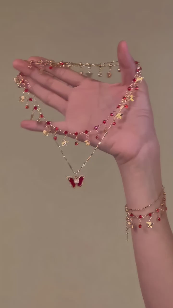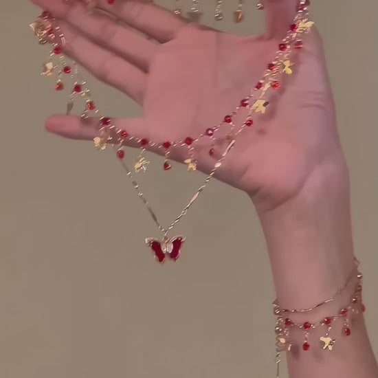 Y2K Mädchen Roter Schmetterling Doppellagige Kette Halskette & Armband