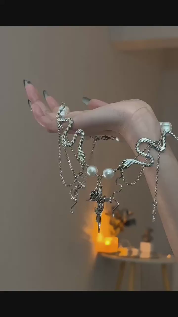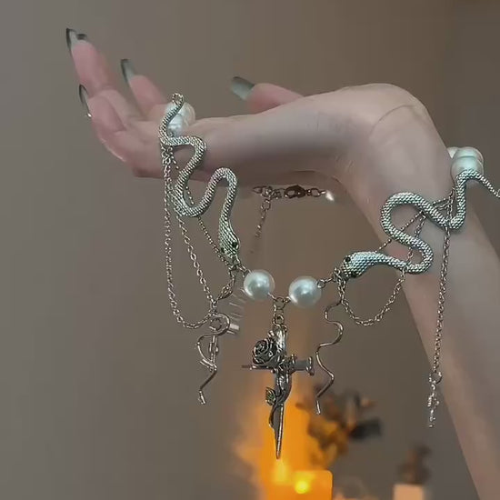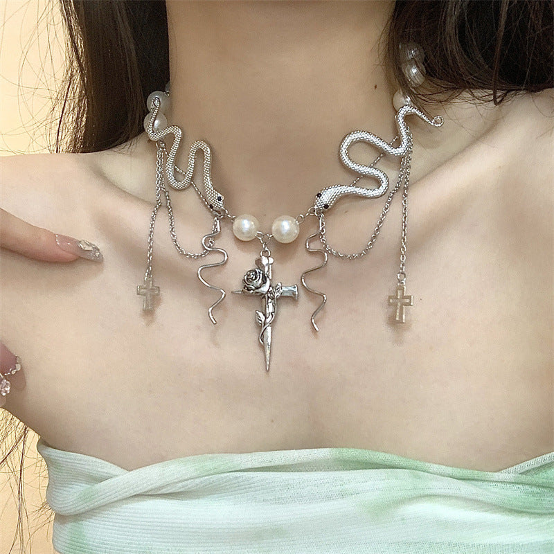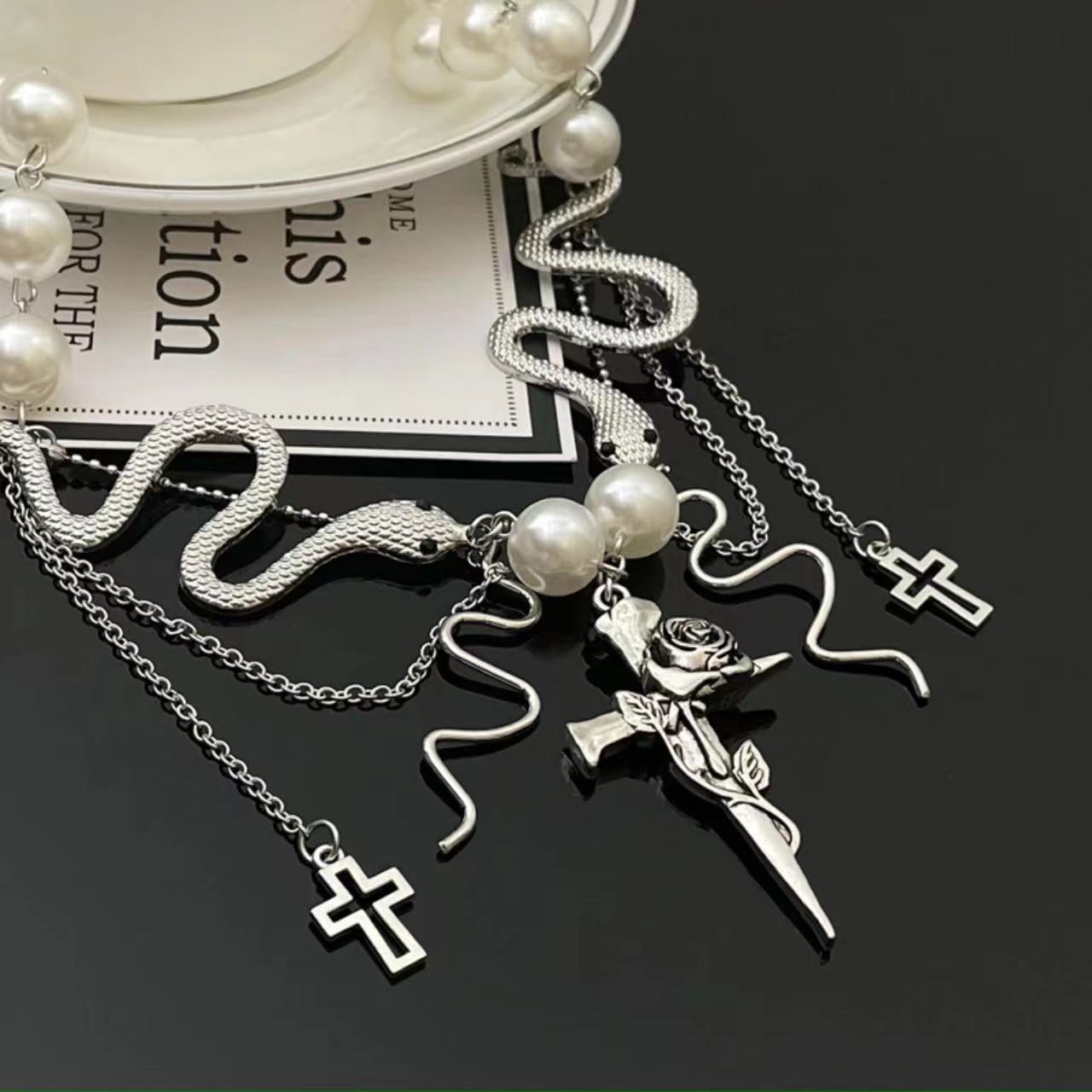Y2K Gothic Stil Doppelte Schlangen- und Kreuzperlenkette