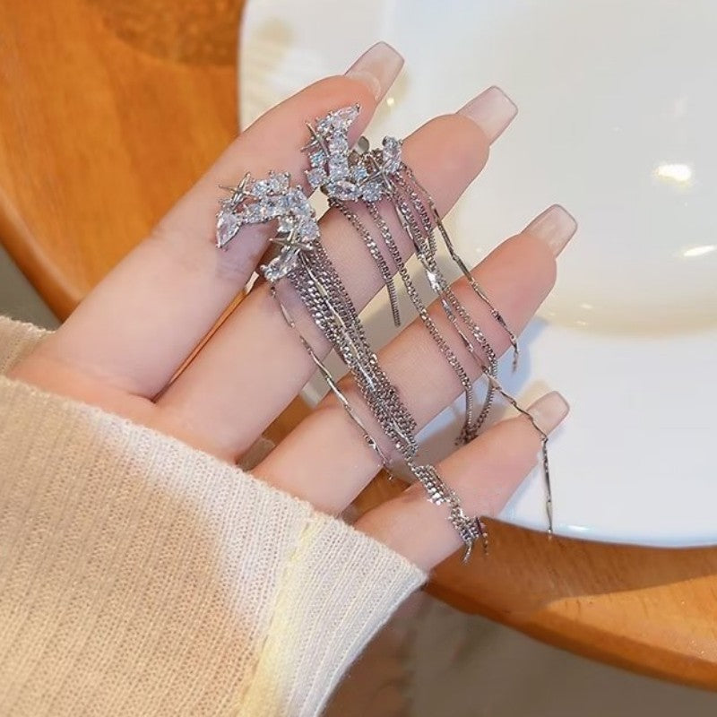 Shining Chic Women Rhinestone Moon Long Tassel Ear Cuff